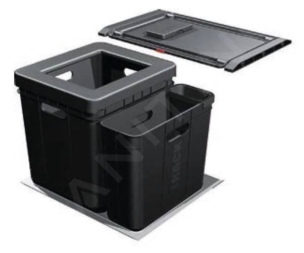 Les bacs 350, Trolley Vario et Easysort sont placés dans un tiroir à coulisse complète équipé d’un cadre longitudinal ou d’une paroi latérale haute. Nous recommandons les dispositifs à coulisse complète des entreprises Blum, Grass ou Hettich pour ces poubelles.